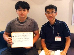 当日は自分でアイシングして次の日に当院にご来院頂きました。まだ腫れも強く皮下出血斑もありました。超音波診断機の観察では大きな靭帯の断裂は無かったので、1度の捻挫の処置をしました。テーピング固定と包帯固定を生活の状態応じて処置して電療で痛みを取りつつ、3週間でほぼ痛み無く簡単な装具を装着しながら練習に復帰しました。捻挫は痛みが取れても靭帯が修復するまでに3週以上はかかります。無理をすると靭帯が伸びて捻挫を繰り返し易くなりますので、できるだけ専門の治療院で治療してくださいね。