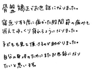 患者さんは、当院で3回目(お子様3人目)の産後骨盤矯正に来ていただきました。今回も産後の骨盤まわりが激痛だったとのことで、施術させていただき、施術を重ねるごとに痛みが改善され、骨盤が安定しました。またいつでもお越しくださいね(^^♪